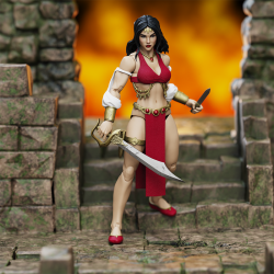 Esta representación a escala 1:12 de Bêlit, Reina de la Costa Negra, está diseñada para mostrar tanto su ferocidad como capitana pirata de La Tigresa como su real majestad como gobernante de la Costa Negra.