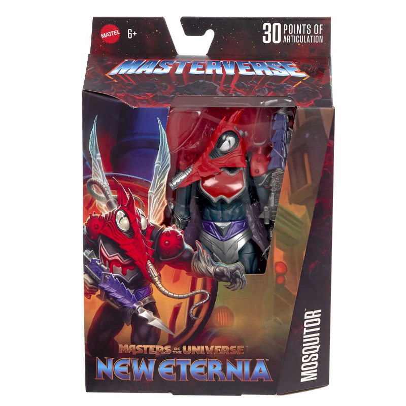 Esta figura de acción de Mosquitor de Nueva Eternia se une a la línea Masterverse de Masters of the Universe. Diseñada a escala de 18 cm con 30 puntos de articulación, este insectoide chupa-energía cuenta con alas articuladas, una icónica cabeza chupasangre, un bláster y tres accesorios que se pueden usar con la cabeza o el bláster. Su armadura incluye un arnés de pecho con un panel frontal alternativo. Una manguera se conecta desde su cabeza hasta la parte posterior del arnés de pecho. Este malvado esbirro de Hordak cuenta con el alto nivel de detalle que esperan los coleccionistas y se presenta en una elegante caja con ventana ideal para exhibir. Mosquitor es una gran adición a cualquier colección de Masters of the Universe; apto para fans de MOTU a partir de 6 años.