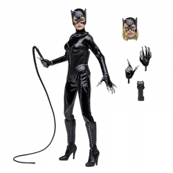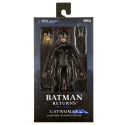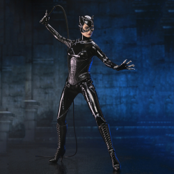 NECA presenta esta figura de acción vestida de Catwoman de Batman Returns, con la imagen autorizada de Michelle Pfeiffer, cuya inolvidable actuación en la película de Tim Burton de 1992 aún define al personaje. Selina Kyle, la secretaria reprimida y menospreciada del corrupto industrial Max Shreck, lleva una vida normal y sin incidentes. Eso es así hasta que él intenta matarla después de que ella descubre su siniestro secreto para extraer energía de la red eléctrica de Gotham, dándole a Shreck el control total de la energía de Ciudad Gótica. Tras sobrevivir a la caída y ser despertada por gatos callejeros, desata su verdadera naturaleza feroz y renace como Catwoman. Se alía con El Pingüino para vengarse de Shreck y Batman, quien intenta frustrar sus planes criminales.