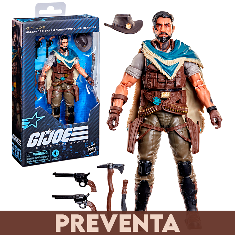 Accesorios inspirados en el personaje: esta figura de Alejandro Balam "Sundown" Luna Mendoza incluye 5 accesorios, incluyendo 5 inspirados en el personaje: hacha, cuchillo, sombrero y dos accesorios de armas; además de un poncho extraíble.