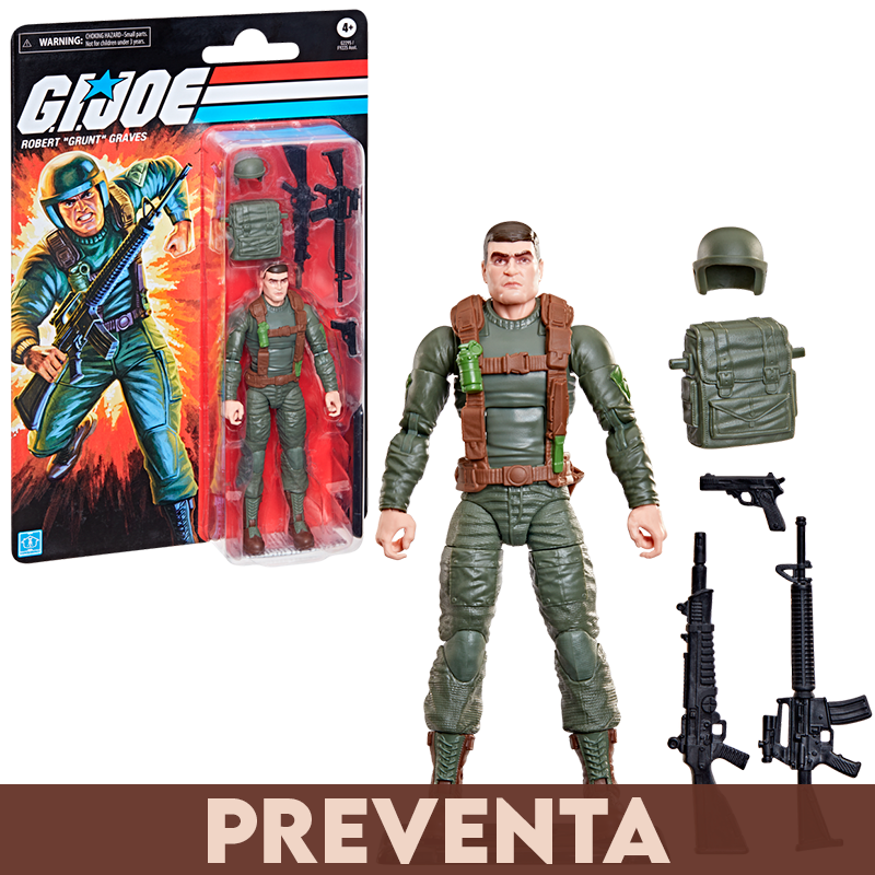 Esta figura de Robert “Grunt” Graves incluye 7 accesorios: casco, mochila, rifle láser XMLR-3A, base y accesorios para armas.